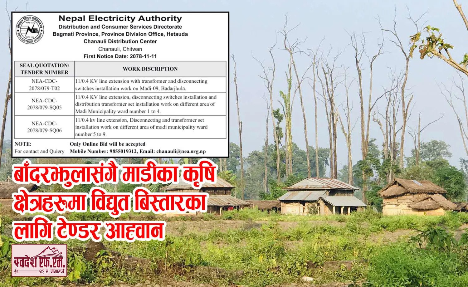 चितवन । माडीको बाँदरझुलासंगै कृषि र मत्स्यपालन क्षेत्रहरुमा विध्युत बिस्तारका लागि नेपाल विध्युत प्राधिकरणको चनौली वितरण केन्द्रले बोलपत्र (टेण्डर) आह्वान गरेको छ ।