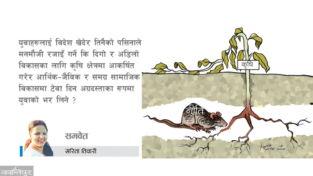कृषिलाई थेग्न धेरै ठूला काम गर्नुपर्दैन, यो व्यवस्थालाई विवेकशील मात्रै बनाइदिए पुग्छ । जैविक र पर्यावरणीय विविधताअनुकूलको कृषि नीतिको निर्माण र कार्यान्वयन गर्ने, आकर्षक कृषि अनुदान र सस्तो ऋण लगायतका कार्यक्रमबाट सबै वर्ग क्षेत्र र लिंगका उद्यमी लाभग्राही बन्न सक्ने समाजवादी चरित्रको पारदर्शी पद्धति बनाउने, कृषिका लागि भू–उपयोगमा सरकारले बनाएको नीति अनुसार भूमि बैंकको प्रावधानलाई इमानपूर्वक कार्यान्वयन गर्ने, यस क्षेत्रमा आउन चाहने युवा कृषकहरूलाई बढीभन्दा बढी यसैमा टिकाइराख्ने र व्यावसायिक कृषि प्रवद्र्धनमा उनीहरूको सक्रिय भूमिकाका क्षेत्र निर्धारण गर्ने कामलाई तीव्रता दिने, कृषि अनुसन्धानकर्मी र अध्येताहरूका लागि पर्याप्त मात्रामा जमिन उपलब्ध गराएर सरकारी लागतमै बीउ तथा मल (खास गरी जैविक मल) उत्पादन र बिक्रीमा जोड दिने एवं वातावरण तथा खाद्य उपभोगमा असुरक्षा नहुने गरी मात्र औद्योगिक कृषि उत्पादनलाई बढावा दिने । यति कामका लागि राज्य आफैंले बनाएको कृषि नीतिकै अक्षरश: परिपालन गरे पुग्छ । युवाहरूलाई विदेश खेदेर तिनैको पसिनाले मनमौजी रजाइँ गर्ने कि दिगो र अडिलो विकासका लागि कृषि क्षेत्रमा आकर्षित गरेर आर्थिक–जैविक र समग्र सामाजिक विकासमा टेवा दिन अग्रदस्ताका रूपमा युवाको भर लिने ? दैनन्दिन सत्ताकै छिनाझपटीमा मग्न दलहरू र स्थायी सत्ताका रूपमा कामभन्दा कुरा बढी गर्दै ढलीमली गरिआएको कर्मचारीतन्त्रलाई यसरी सोच्ने फुर्सद होला ?