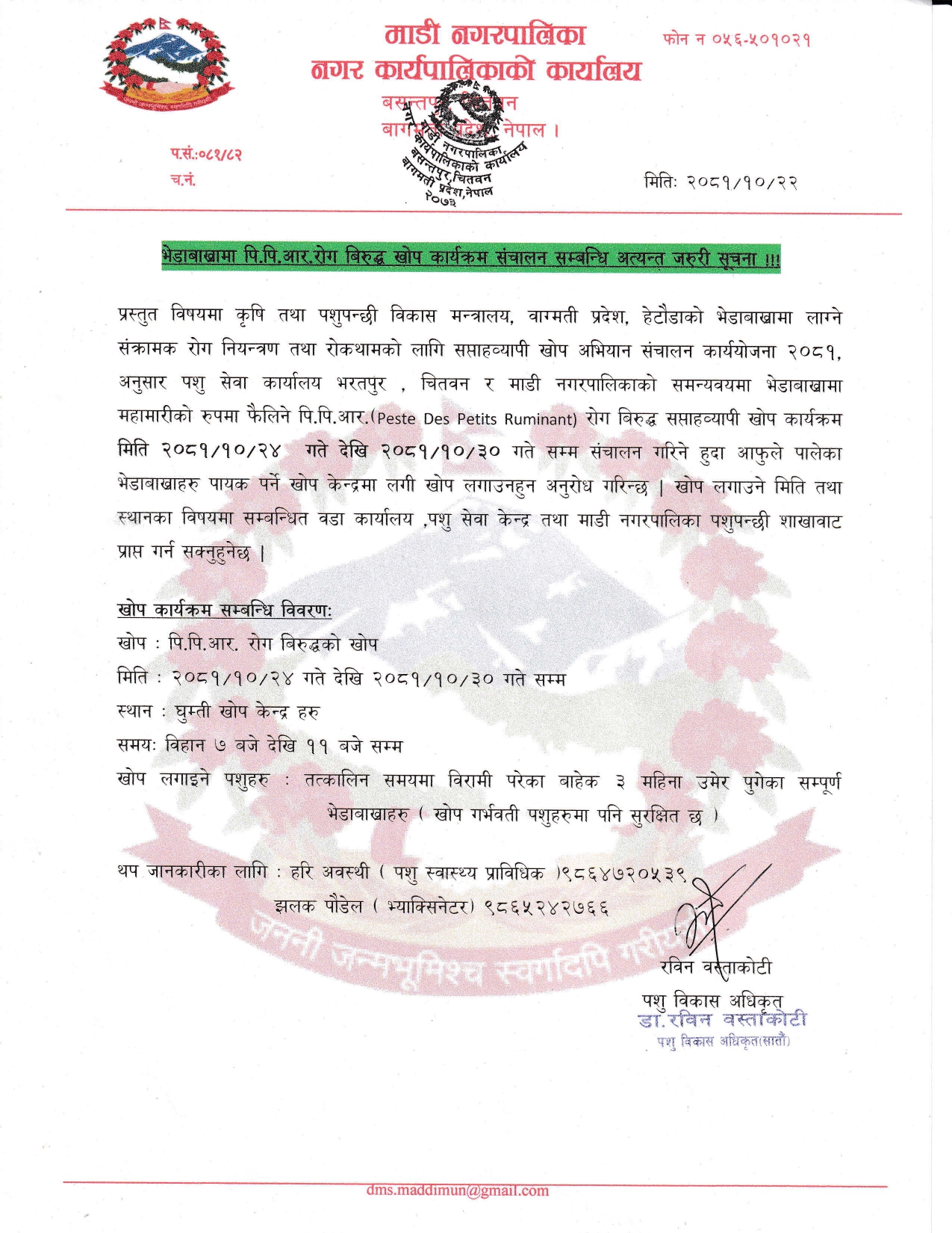 | भेडाबाख्रामा पि.पि.आर.रोग बिरुद्ध खोप कार्यक्रम संचालन सम्बन्धि अत्यन्त जरुरी सूचना !!! |