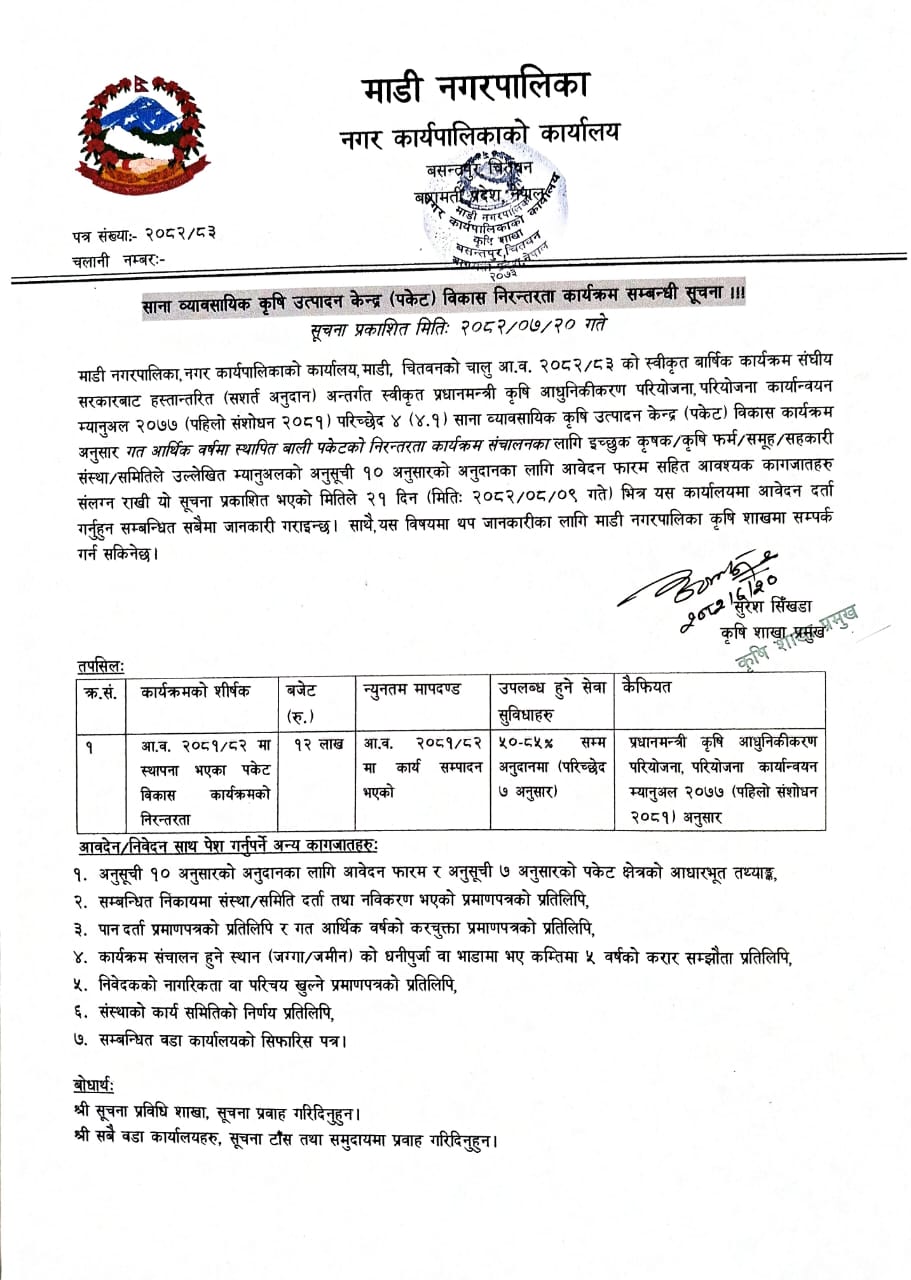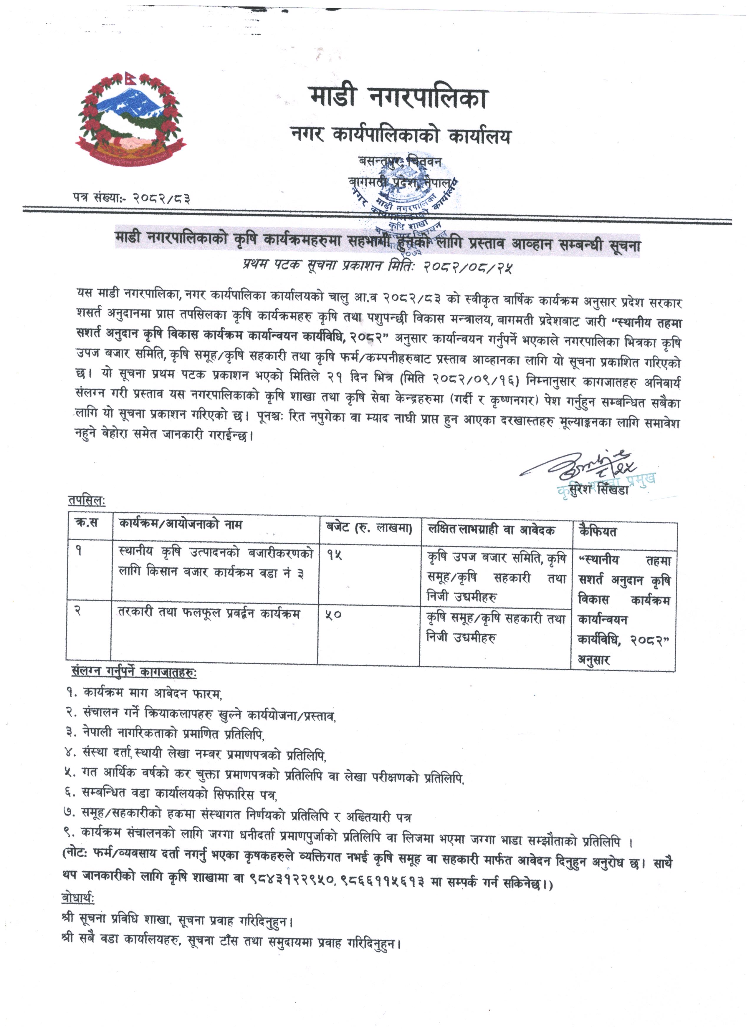 | माडी नगरपालिकाको कृषि कार्यक्रमहरुमा सहभागी हुनको लागि प्रस्ताव आव्हान सम्बन्धी सूचना !!! |