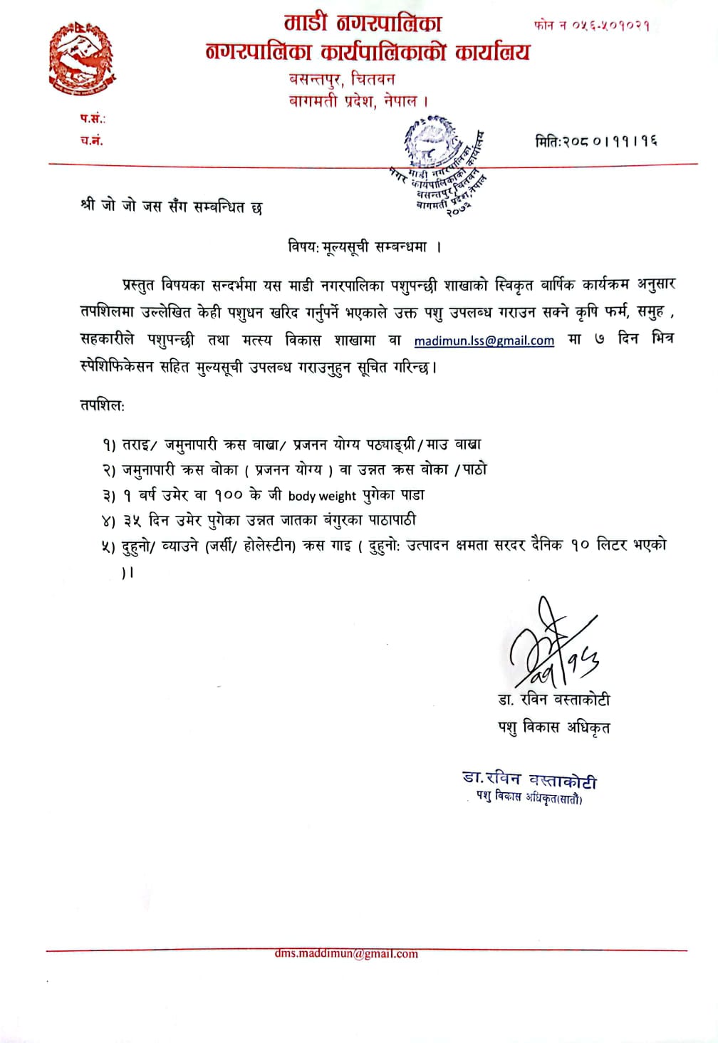 | पशुपंक्षी तथा मत्स्य क्षेत्र प्रवद्धन सम्बन्धी कार्यक्रमहरु संचालनका लागि प्रस्ताव आह्वान सम्वन्धी सुचना |
